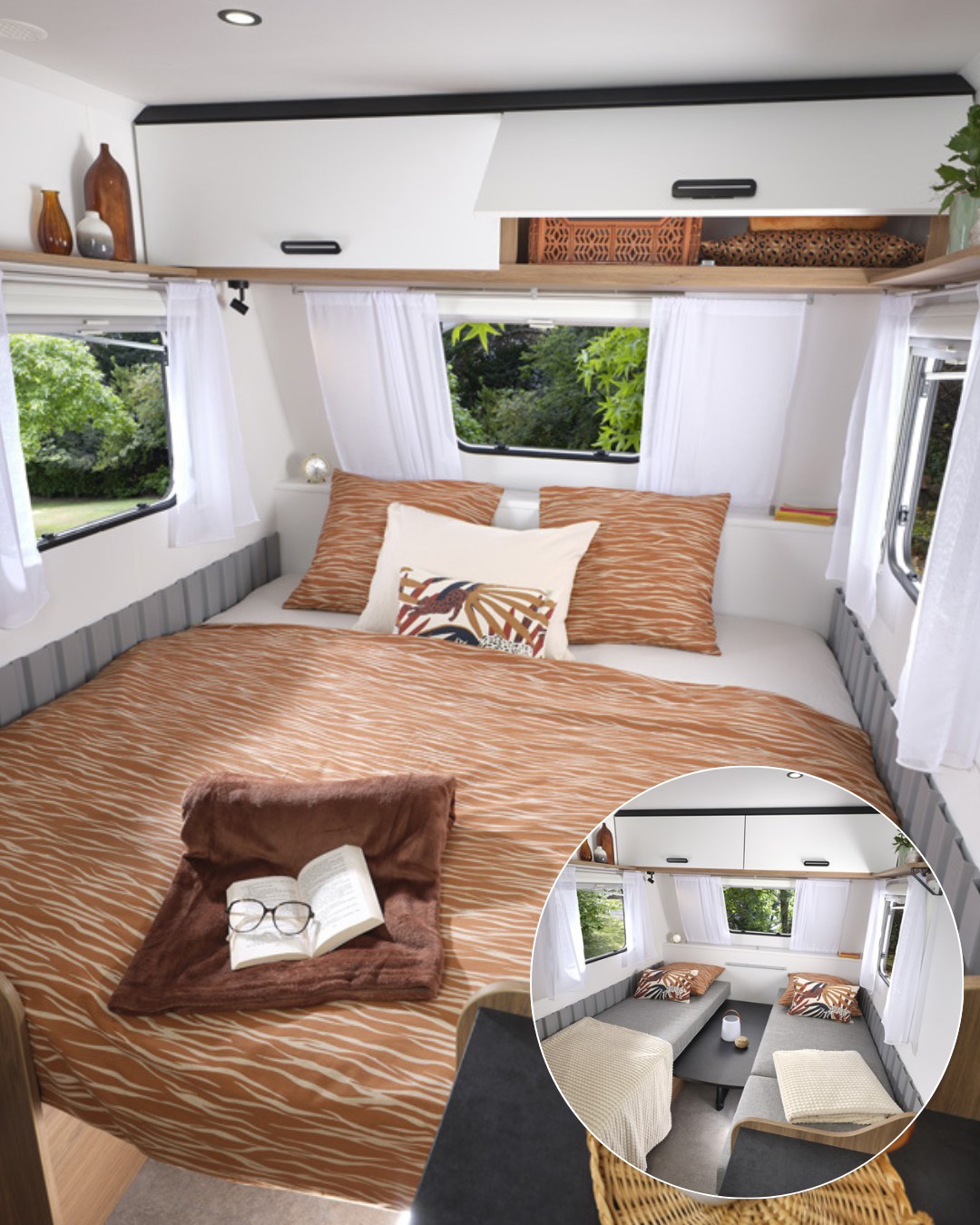 Caravane TOP EQUIPÉE (Antilacets, Amortisseurs, Roue de secours, Vérins renforcés, Portillon extérieur latéral, Lanterneau panoramique, Moustiquaire de porte, Spots de lecture lit parents…)