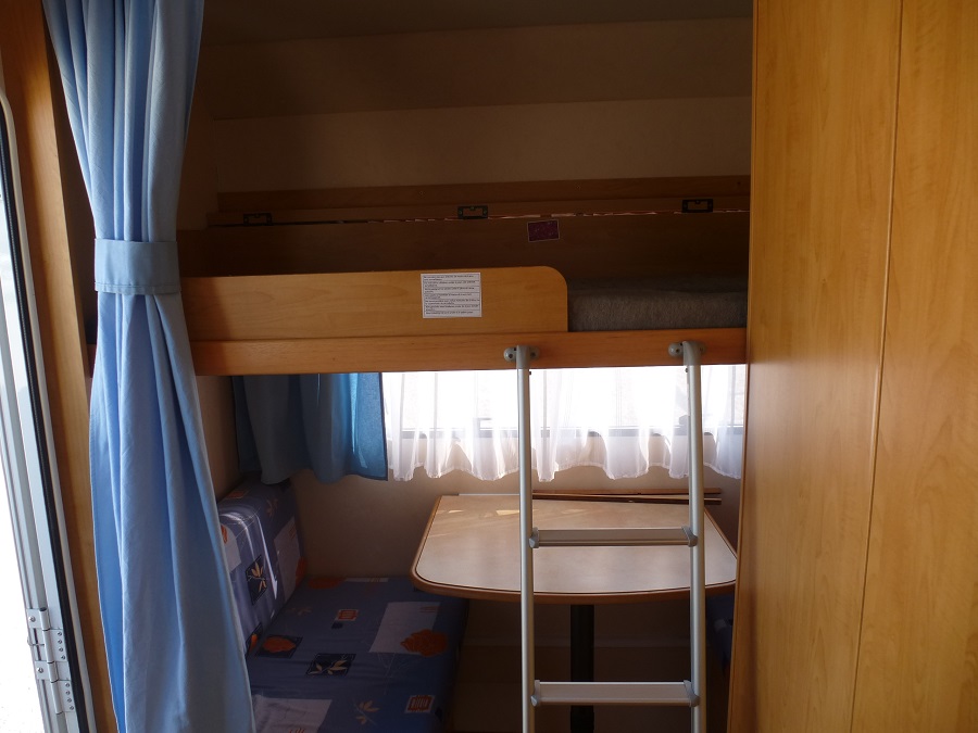 Son coin dinette lumineux et chaleureux se transforme en couchage avec au-dessus un lit superposé escamotable permettant l’accueil de deux enfants. Elle possède également une penderie, un coin cuisine avec combiné réchaud 3 feux et cuve évier inox avec couvercle en verre, un réfrigérateur 12/220/gaz, un coin toilette avec WC à cassette et bac de propreté ainsi que de nombreux rangements.