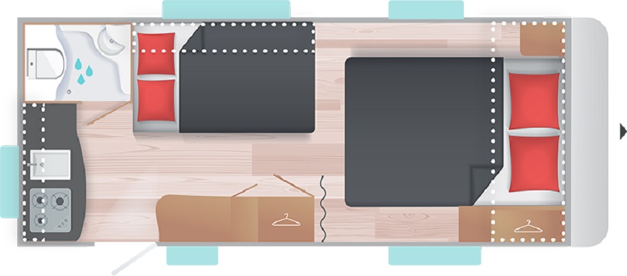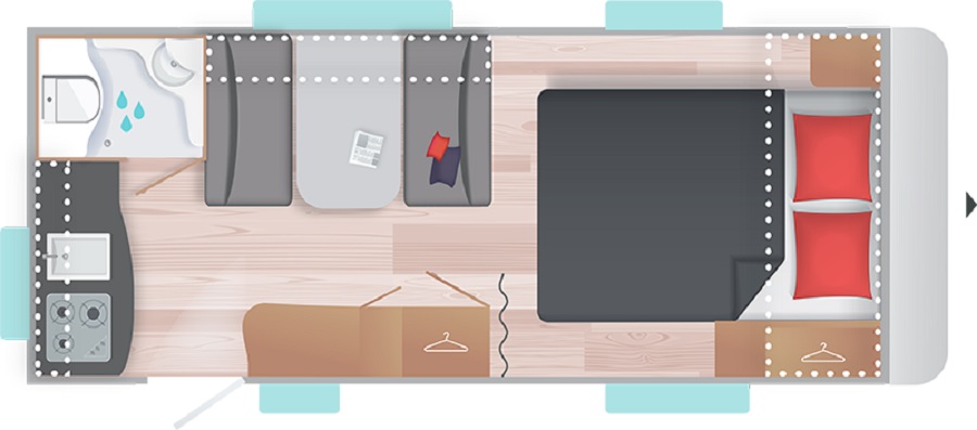 Caravane rigide Caravelair Antares style 460 facile à tracter avec ses moins 6 mètres, elle a un joli salon transformable en couchage pour deux personnes, un lit central confortable avec sommier à lattes. Profitez en plus de son portillon sous lit qui donne accès à un grand espace de stockage. Les amoureux de la cuisine ou les amateurs de pâtisseries seront séduit par la cuisine dotée d’un grand plan de travail comprenant un réchaud 3 feux, évier cuve inox et réfrigérateur 140L. Elle possède également une salle de bain avec douche et cabinet de toilette, sans oublier ses nombreux rangements astucieux.