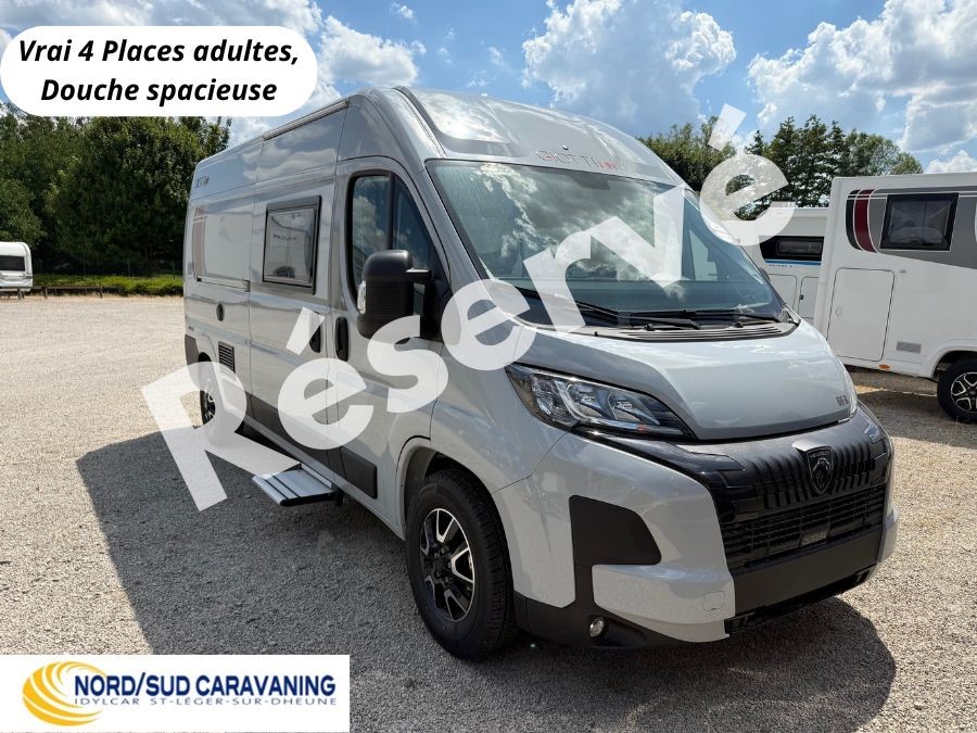 Le Giottiline Giottivan 60B est un fourgon aménagé sur porteur Peugeot Boxer, de 5.99m de long offrant 4 couchages avec une chambre 3 en 1.