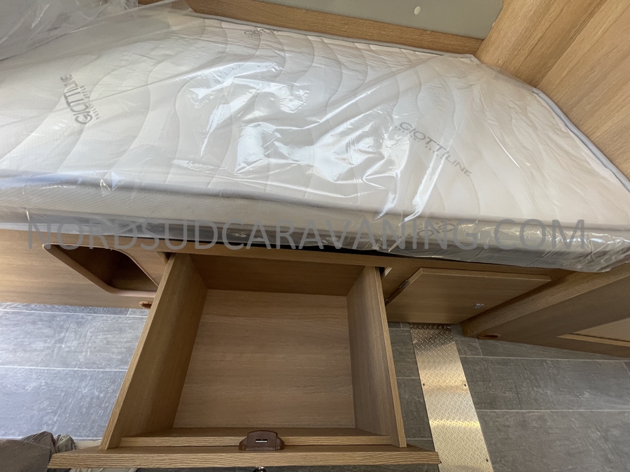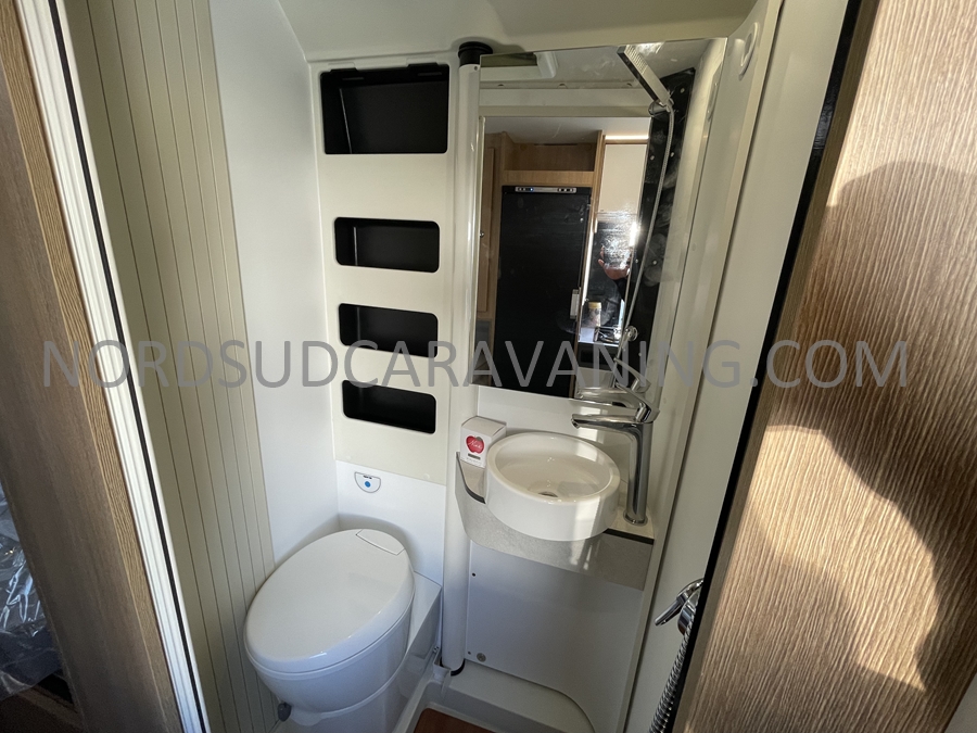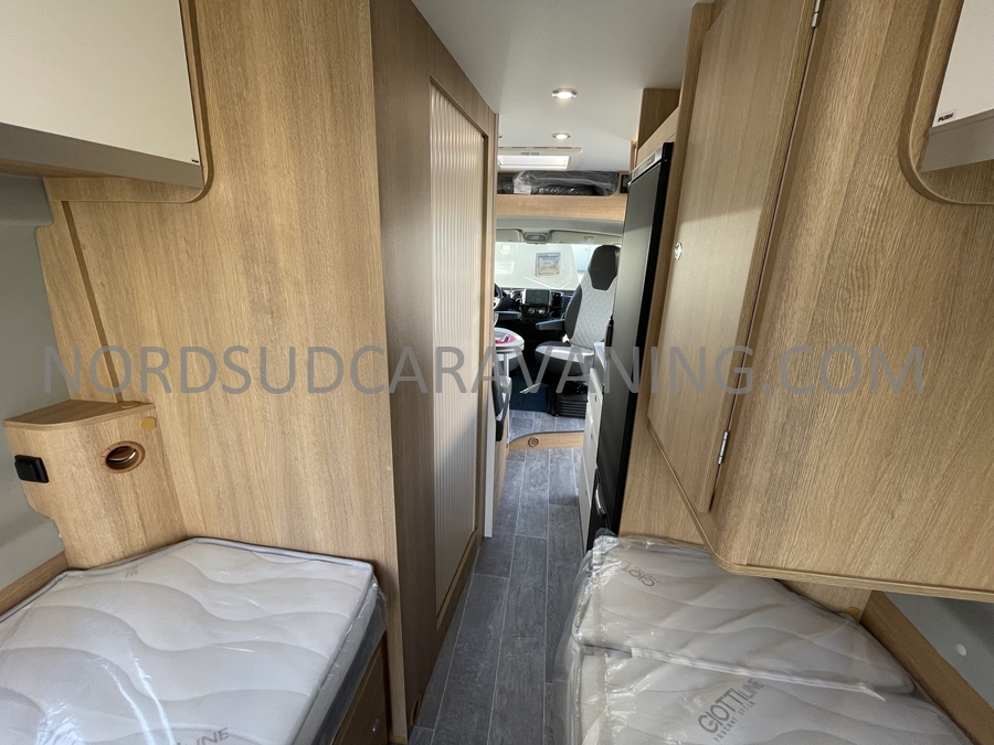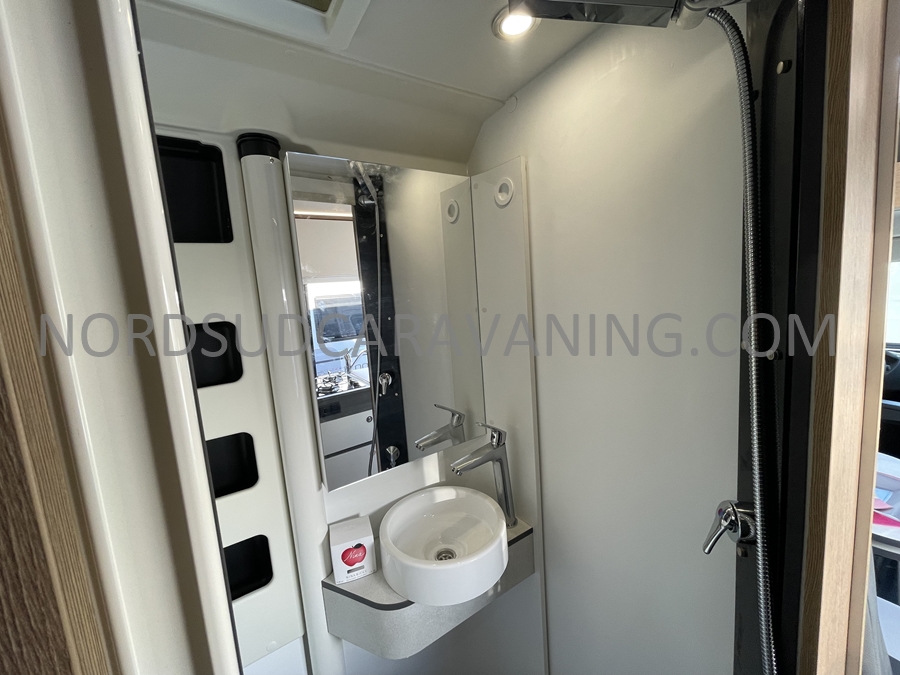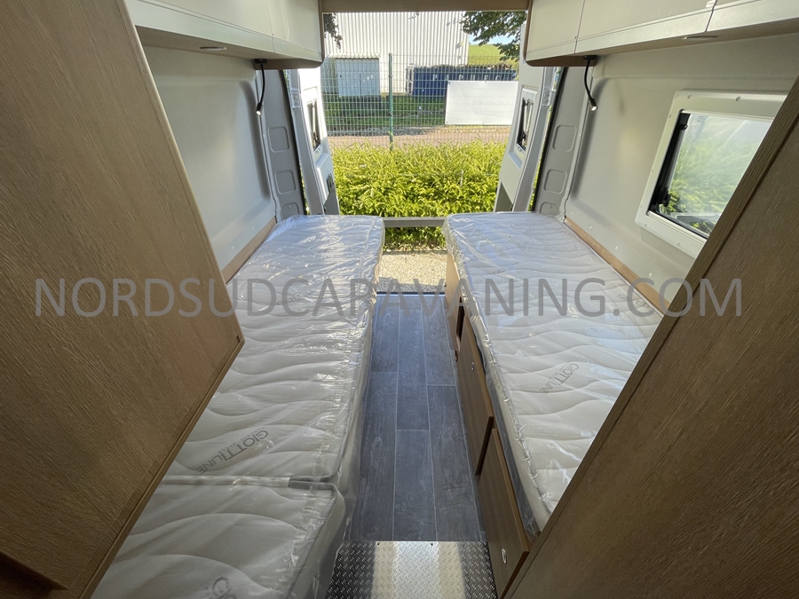 Long de 6,36 mètres, il offre une zone nuit XXL avec lits jumeaux arrières transformable en un grand couchage, de grands volumes de rangement et un espace de vie lumineux et fonctionnel. La salle de bain est bien aménagée, et les meubles modernes rendent chaque recoin pratique et agréable.