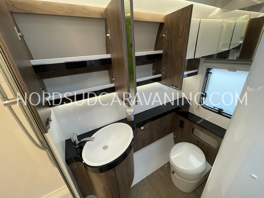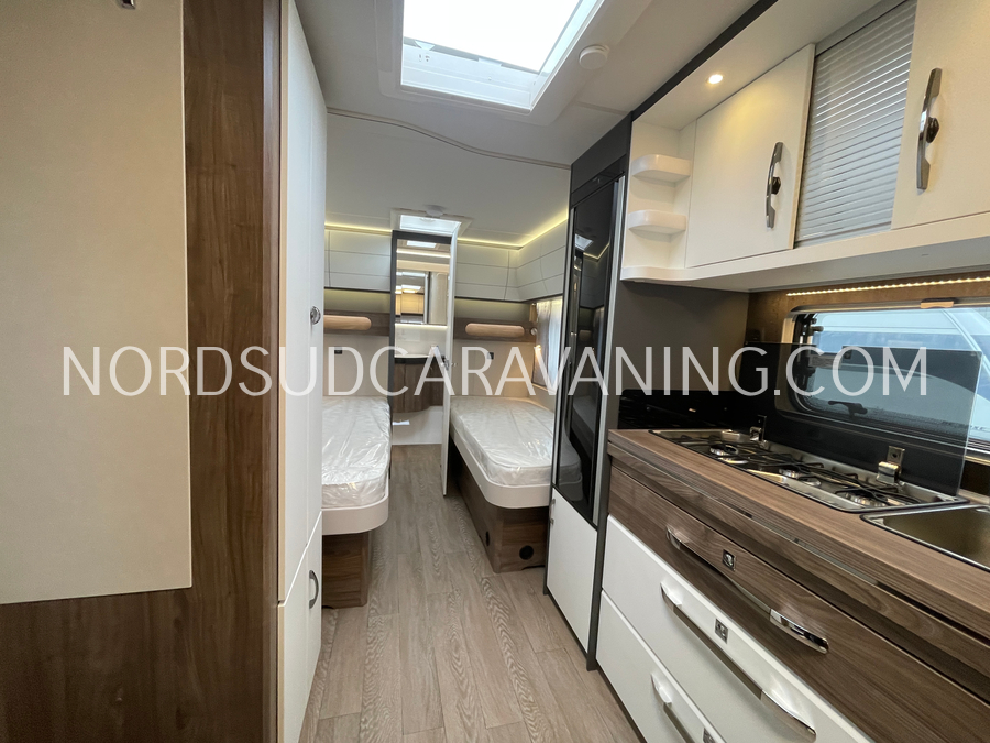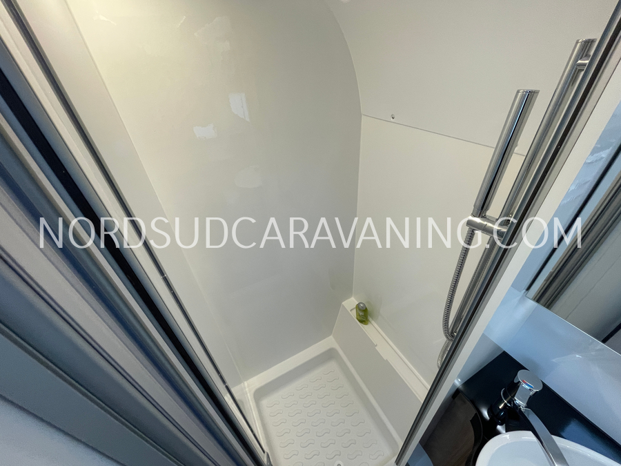 Elle est très agréable à vivre avec son joli salon en U transformable en couchage pour 2 personnes. Très bel espace nuit avec ses lits jumeaux très confortables et ses nombreux rangements. Cuisine spacieuse équipée d’un réfrigérateur à absorption de 133L, d’un réchaud 3 feux gaz, d’un évier cuve inox et de placards de pavillon. Elle a également un joli espace salle de bain à l’arrière avec WC, Lavabo et une véritable cabine de douche séparée.