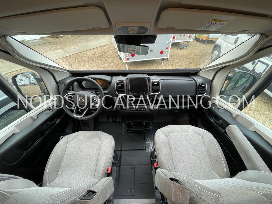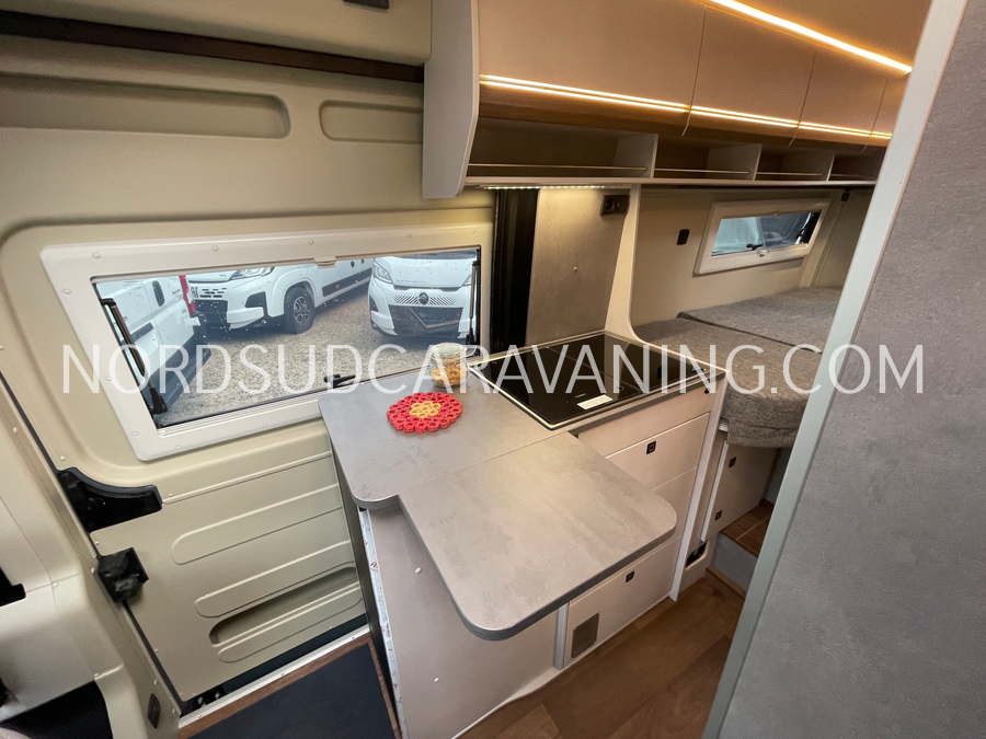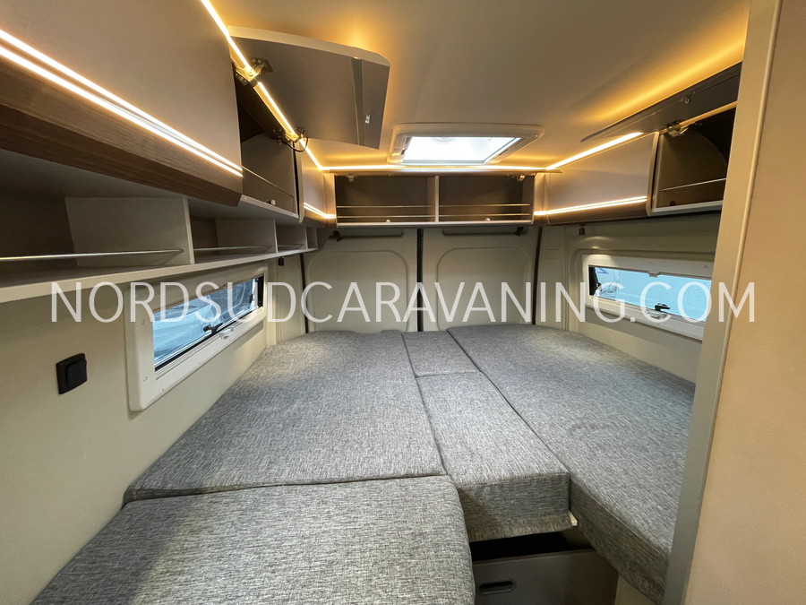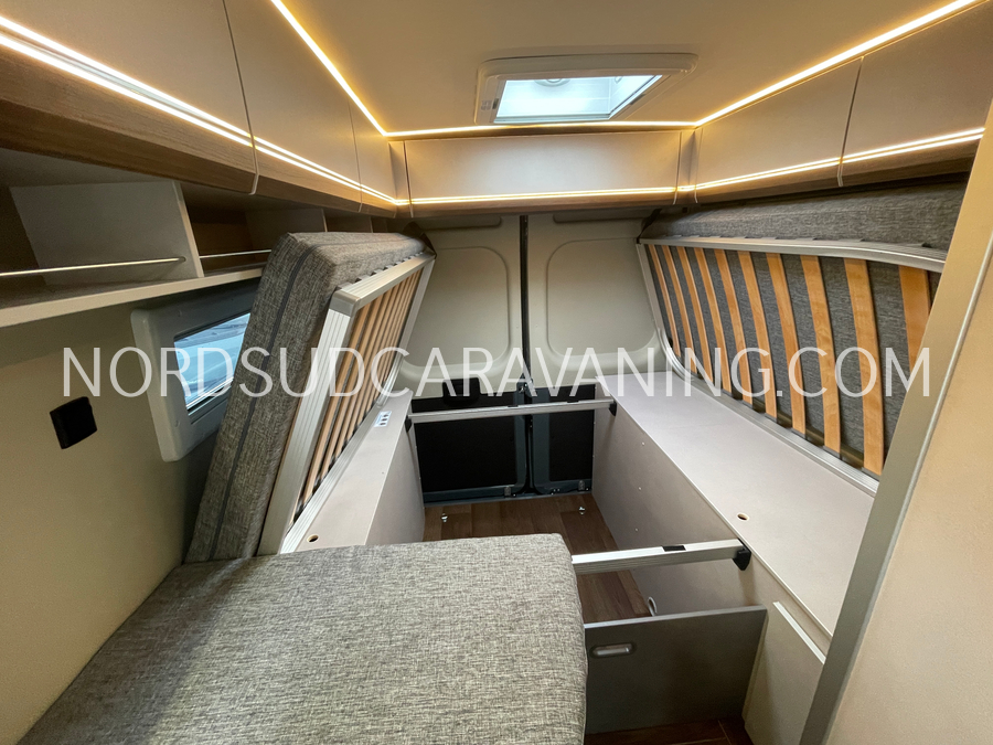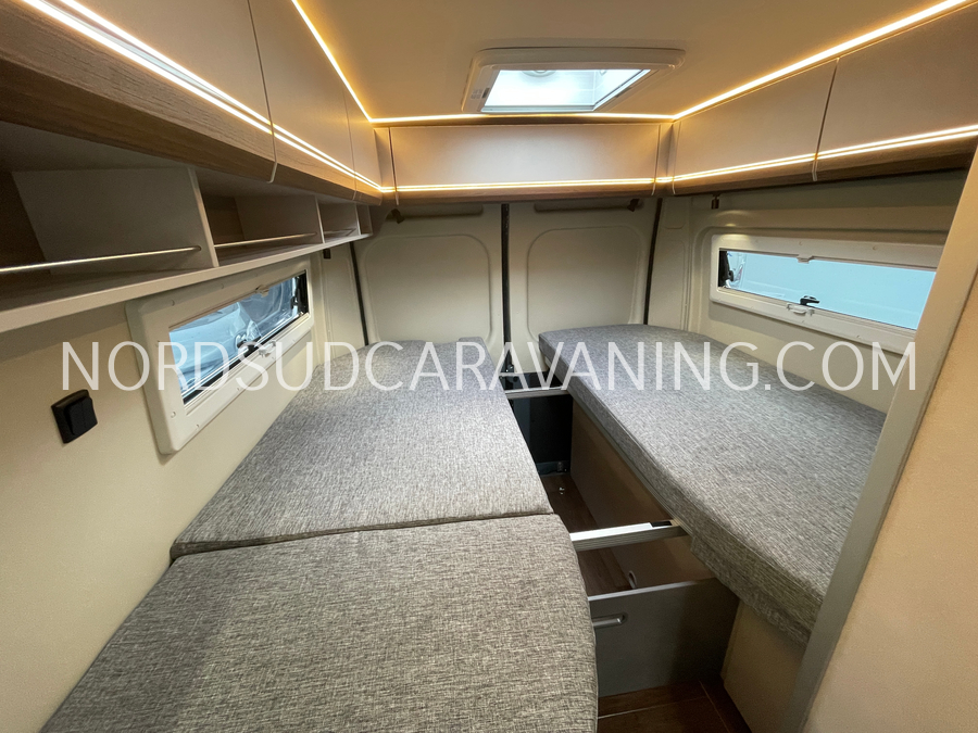 Long de 5.99 mètres, il offre à l’arrière une zone de nuit XXL avec lits jumeaux unifiables.