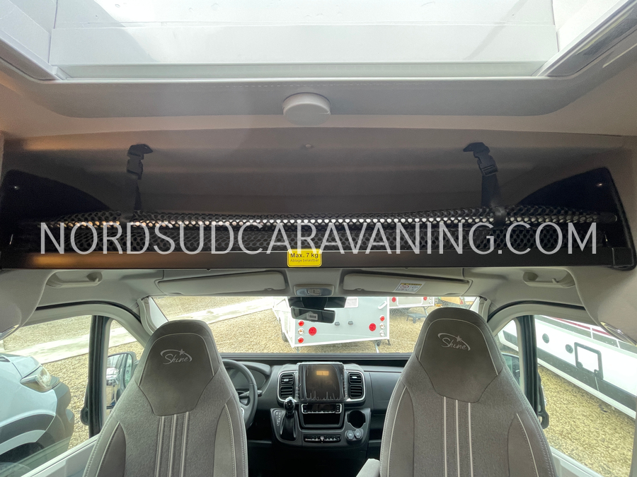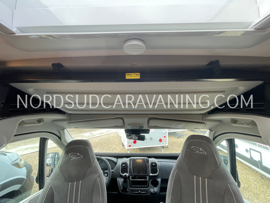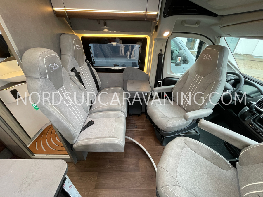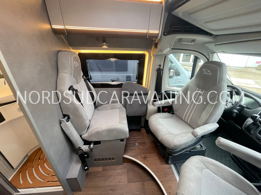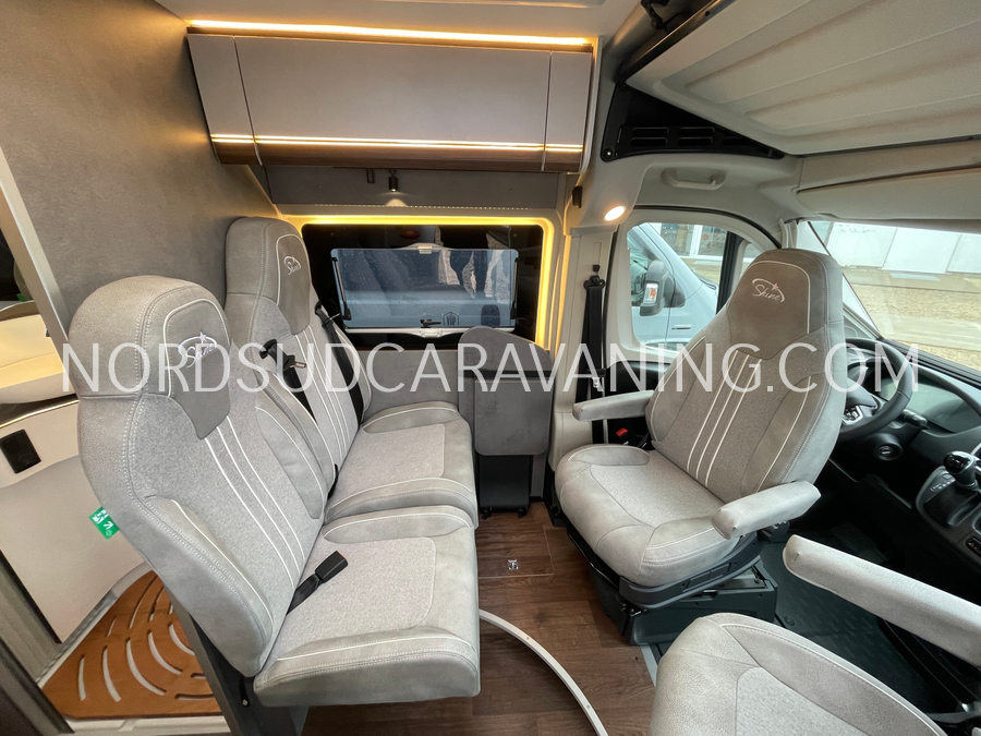 Long de 5.99 mètres, il offre à l’arrière une zone de nuit XXL avec lits jumeaux unifiables.