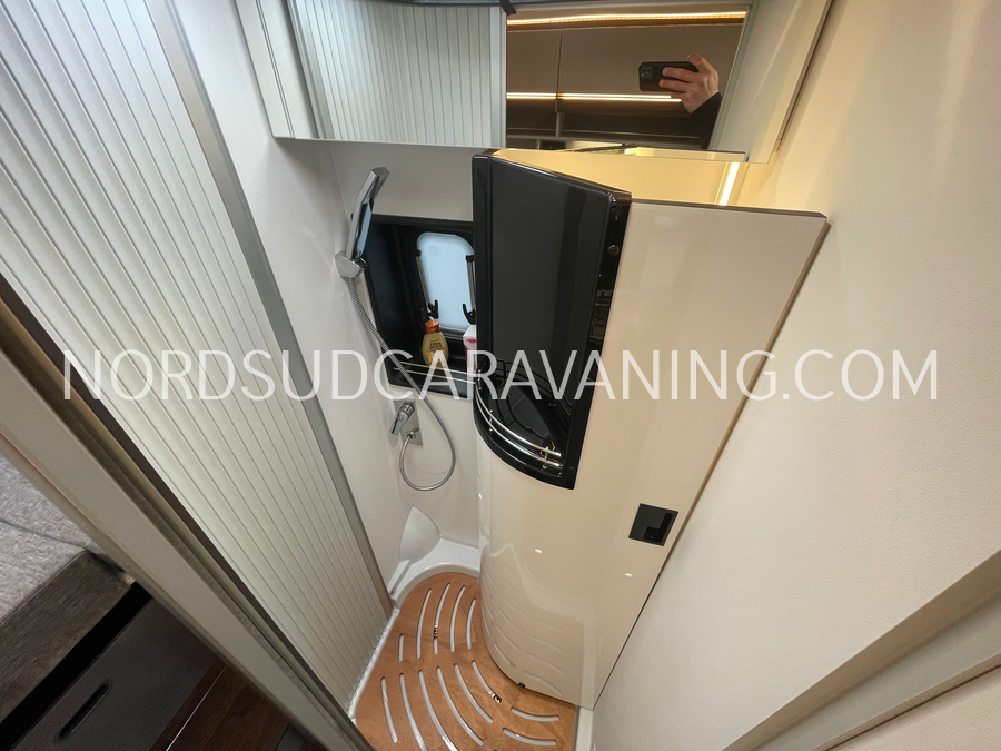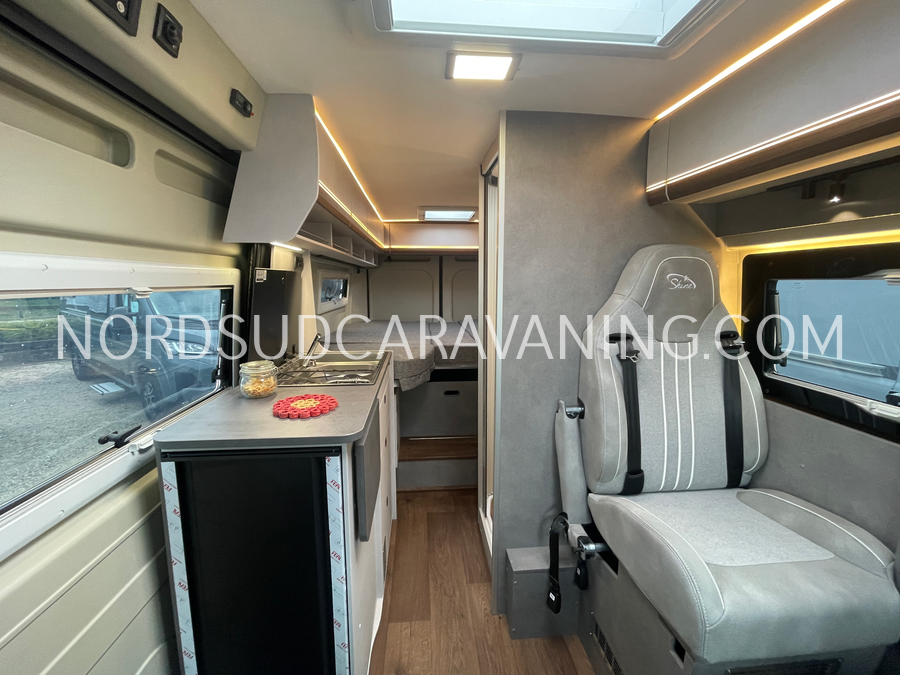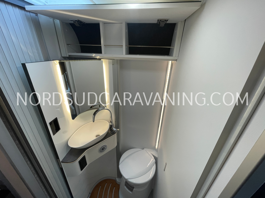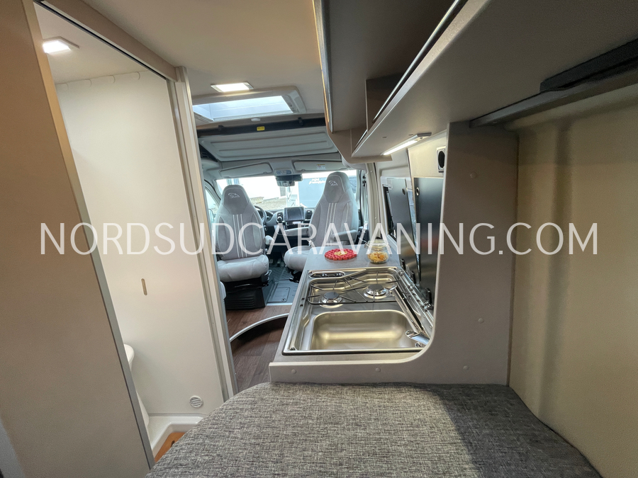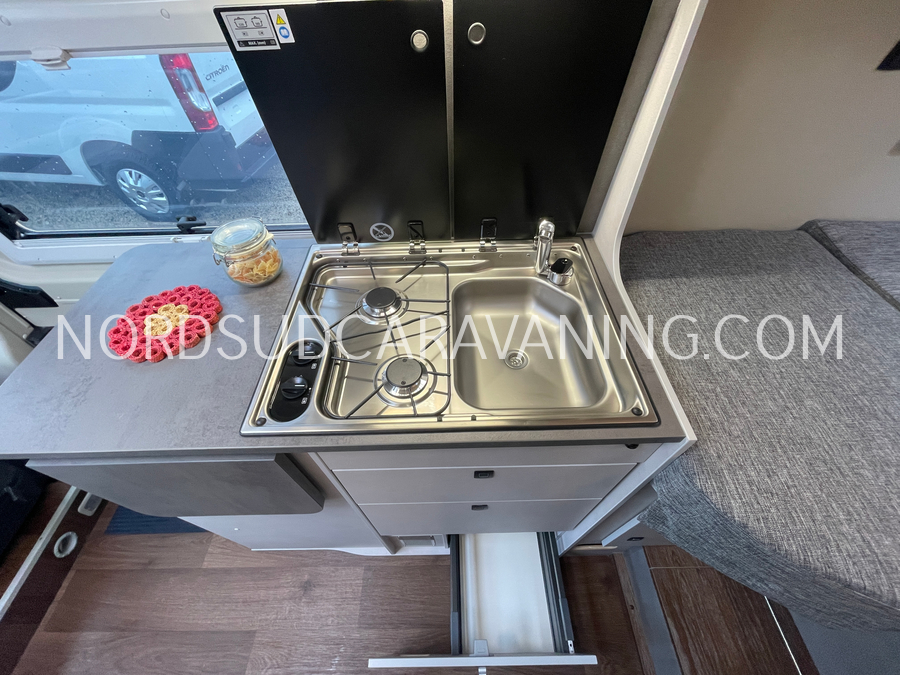 Sa dinette est agréable et lumineuse pour une ambiance conviviale. Sa cuisine latérale, pratique et fonctionnelle est équipée d’un réchaud 2 feux, évier et plan de travail rabattable. En face, une jolie salle de bain avec WC, lavabo et une douche vario spacieuse. Sans oublier ses nombreux rangements astucieux !